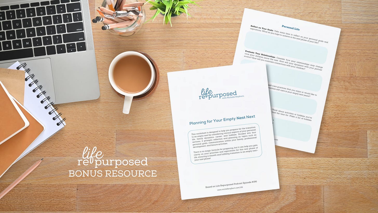 This bonus workbook is designed to help you prepare for the transition to an empty nest by considering various aspects of your personal life, family dynamics, career, and hobbies. Divided into four sections, it prompts reflection and planning on topics such as personal goals, communication within your family, professional development, and leisure activities.
